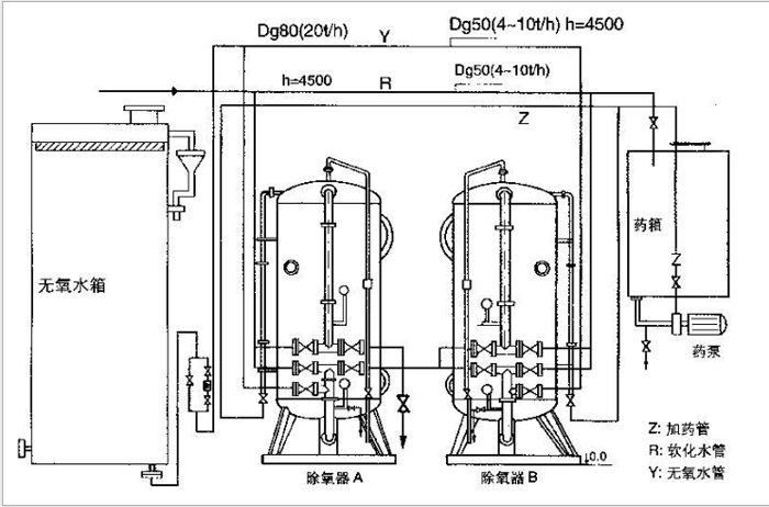 氧化還原樹脂除氧器是一種新型的除氧器,它是利用亞硫酸鈉的可氧化性能,使亞硫酸鈉和水中的氧氣在樹脂上發(fā)生反應(yīng),生成硫酸型樹脂,然后在利用亞硫酸鈉進(jìn)行還原,恢復(fù)其在氧化功能。除氧水箱應(yīng)與空氣隔絕,可以設(shè)單罐或雙罐,都能保證連續(xù)供應(yīng)脫氧水。