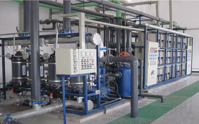 (四)、高純水設(shè)備的EDI工藝系統(tǒng)選用經(jīng)過一次反滲透除鹽后的水作為進(jìn)水,再經(jīng)過EDI模塊內(nèi)離子交換樹脂進(jìn)行二次除鹽;這樣可以使純水制造過程連續(xù)化,它替代了傳統(tǒng)DI混合樹脂床制造去離子水的方法,避免使用酸堿再生;大量減少酸堿成本投入的同時(shí)也可以有效避免環(huán)境污染。