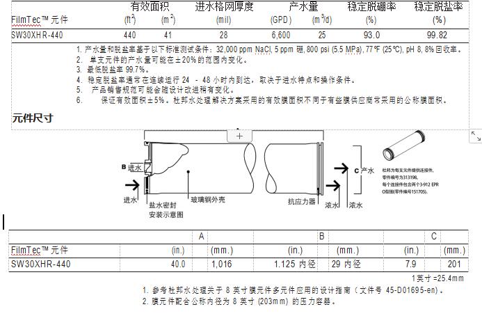 在 FilmTec™ 產品系列里,SW30XHR-440 元件是脫鹽率最高的海水反滲透膜元件, 多數情況下,采用一級海水反滲透系統就可達到嚴格的水質要求。此外,最高 有效膜面積和較寬進水格網的組合,能夠提高生產率,降低清洗頻率,從而實 現可持續的較低的運行周期成本。FilmTec™ SW30XHR-440 元件有以下優點 :