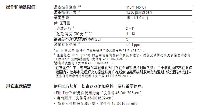 • 無需進行氧化后處理保證了在整個運行周期內都能保持高性能。FilmTec™ 元 件更耐用,且能在更寬泛的 pH 值范圍(1-13)內進行化學清洗。
