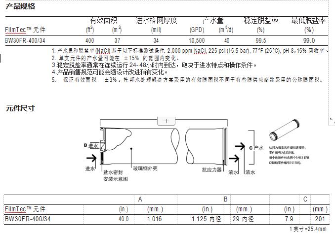 FilmTec™ BW30FR-400/34 是一款適用于處理高污染水源、同時 具有抗污染性、高脫鹽率和高產水量的抗污染膜元件。