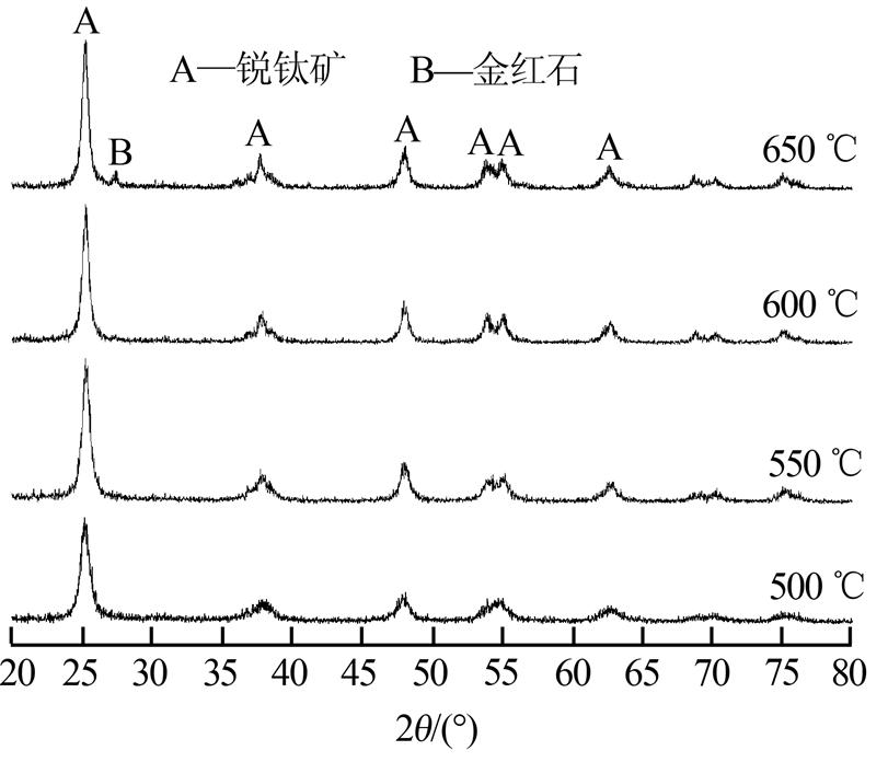 圖 2給出了摻雜Gd 0.2%、S 1.0%的TiO2催化劑在500~650 ℃的XRD衍射圖譜。