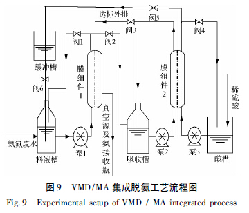 含氨廢水預(yù)先用0. 2 mol /L 的NaOH 溶液調(diào)節(jié)pH 至10. 5 后引入真空脫氨料液槽中,由真空脫氨循環(huán)泵1 泵入PP 脫氣膜組件1 的內(nèi)側(cè),脫氨后返回料液槽,當(dāng)脫氨效率達(dá)到80% 以上時(shí)關(guān)閉閥門1 開啟閥門2 將VMD 處理后的料液引入MA 吸收槽中。重新調(diào)整pH 為10.5 后泵入PP 脫氣膜組件2 內(nèi)側(cè)進(jìn)行膜吸收脫氨后返回吸收槽,直到脫除效率達(dá)到目的值時(shí),開啟閥門3,調(diào)節(jié)pH 為中性后達(dá)標(biāo)外排。酸循環(huán)槽內(nèi)起始濃度為0. 02 mol /L 的稀硫酸吸收劑被泵入PP 脫氣膜組件2 的膜外側(cè),帶走過膜氨分子回到酸槽,生成硫酸銨。當(dāng)稀硫酸吸收劑pH 大于4 時(shí)開啟閥門5 關(guān)閉閥門4,將硫酸銨溶液引入吸收劑緩沖槽,調(diào)節(jié)至所需pH 后開啟閥門6 流入真空脫氨料液循環(huán)槽中與含氨廢水混合繼續(xù)脫氨。在脫氣膜組件1 中膜另一側(cè)接氨回收真空系統(tǒng)為VMD 工藝提供動(dòng)力,由膜組件1 脫除的氨被氨接收瓶冷凝接收。