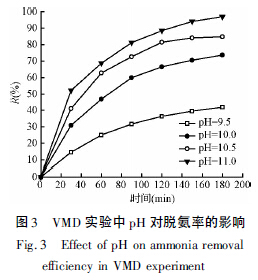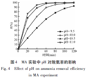 配制濃度為1 000 mg /L 的料液,控制兩側(cè)循環(huán)流速都為0. 10 m/s,料液進(jìn)口溫度40℃,稀硫酸吸收液進(jìn)口溫度20℃,濃度0. 02 mol /L,調(diào)節(jié)料液pH分別為9. 50、10. 0、10. 5 和11. 0 進(jìn)行MA 實(shí)驗(yàn),結(jié)果如圖4 所示。