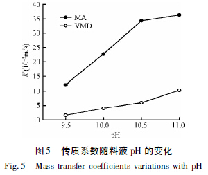 如圖5 所示,pH 值對(duì)VMD 和MA 實(shí)驗(yàn)的傳質(zhì)系數(shù)影響很大,K 值先開始迅速提高后又趨于緩慢增加,隨著pH 由9.50 增大到11.0,2個(gè)膜過程的K值分別由1. 64 × 10-5 m/s、12.11 × 10-5 m/s 升高到了10.33 × 10-5 m/s、36.33 × 10-5 m/s,分別提高到初始K 值的6.3 倍和3.0 倍。這種現(xiàn)象可以通過NH3在水溶液中的電離平衡解釋,提高溶液的pH值,OH-濃度增大,平衡方程h2o向右移動(dòng),生成的氨氣越多,從而提高了膜兩側(cè)的蒸氣壓差,提高了傳質(zhì)動(dòng)力,導(dǎo)致K 值增大。