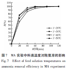 配制濃度為1 000 mg /L、pH 為10. 5 的料液,控制兩側(cè)循環(huán)流速都為0.10 m/s,稀硫酸吸收液進(jìn)口溫度20℃,濃度0. 02 mol /L,調(diào)節(jié)料液進(jìn)口溫度分別為20、30、40 和50℃進(jìn)行MA 實(shí)驗(yàn),結(jié)果如圖7 所示。