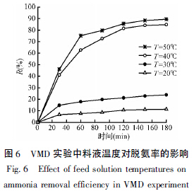 料液進(jìn)口溫度對(duì)VMD 脫氨實(shí)驗(yàn)過程的影響很顯著,隨著溫度的增加,脫氨速度和效率明顯提高,當(dāng)溫度設(shè)置在20℃和30℃時(shí)脫氨效率較低。在料液進(jìn)口溫度達(dá)到40℃時(shí),VMD 脫氨效率明顯提高,料液進(jìn)口溫度調(diào)節(jié)到50℃脫氨效率進(jìn)一步提高,但過高初始料液溫度會(huì)導(dǎo)致整個(gè)工藝能耗大大增加。