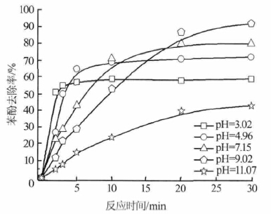 pH=3.02 時,K2FeO4 氧化性能比較強,但卻比較不穩(wěn)定,K2FeO4 還未來得及與苯酚完全反應就分解了,與苯酚的反應時間短,導致苯酚去除率不高。pH= 9.02 時,K2FeO4 的氧化性不及在pH 較低的情況下高,但穩(wěn)定性較好,相對來說與苯酚的反應時間延長了,其對苯酚的氧化分解作用達到比較大。pH=11.07 時,K2FeO4 的氧化性能比較弱,因此對苯酚的去除效果比較差。