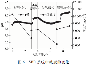纖維素產乙醇廢水經厭氧處理后堿度大幅增加,SBR反應器進水堿度可達10 290 mg / L,氨氮濃度約為213 mg / L。由圖6可知,在2次硝化反應過程中,堿度均呈下降趨勢,比較終降至6 206 mg / L,pH值也相應降低,這是因為硝化反應產生的H十消耗掉了部分堿度,導致系統中堿度減少。亞硝態氮積累到一定程度(≤100mg / L )后停止曝氣,投加適量乙酸鈉為反硝化細菌提供碳源,使得堿度增加,這是因為乙酸鈉作為碳源補償了所消耗的堿度,保證了反硝化反應的順利進行。