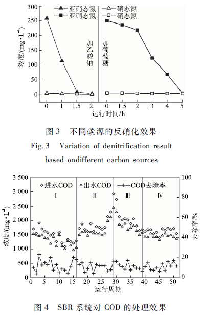 在反應器啟動后,從第17周期(階段II)開始加入反硝化階段。在階段II,為了培養反硝化菌,先對進水進行缺氧處理(前置反硝化),在階段III , IV,運行方式改為先進行短程硝化后反硝化,并且分別投加葡萄糖和乙酸鈉作為外加碳源。反應器進水三氮(氨氮、亞硝酸鹽氮和硝酸鹽氮)在98一458 mg / L之間波動,平均值為274 mg / L 。從圖2看出,NH4+ -N去除雖有波動,但去除率基本保持在80%以上,出水NO2- -N濃度約為192一259 mg / L ,三氮的去除率在25%以下,說明這一階段反硝化效果不佳。在階段III (29一39周期),投加葡萄糖作為碳源,出水NO2- -N濃度迅速由154降低至29mg / L,三氮去除率升高至60%左右,比較高達到73 %,說明此時反硝化菌馴化成功。這一階段反硝化過程需要5一10 h才能完成,為了減少反硝化反應時間,提高反硝化效率,從第40周期開始投加乙酸鈉為碳源。周期實驗發現,使用乙酸鈉后反硝化過程在2h內即可完成,穩定運行后出水NO2- -N濃度低至3 mg / L以下,出水三氮平均值為49 mg / L ,三氮去除率穩定在70%以上,NH4+ -N去除率和三氮去除率保持高度一致,說明此時反硝化效果十分穩定。曾薇等采用A2O工藝處理低C/N比實際生活污水,在反硝化階段投加乙酸鈉和丙酸鈉的混合物為碳源,系統對總氮(TN)的去除率高達75. 4%,此報道和本文的研究結果較接近。