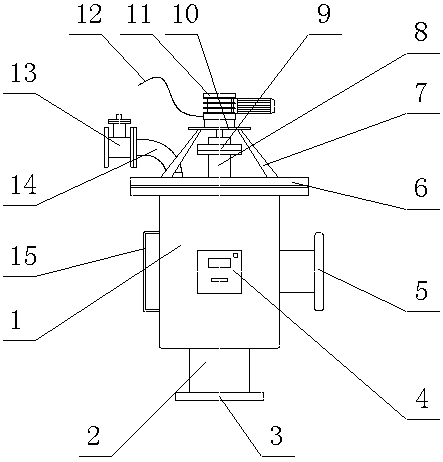 本實用新型的有益效果:本實用新型采用水處理罐體作為對水進行處理的主要部件,連接法蘭的設定在于能穩定的將旋轉電機和彎管道固定在所需位置,并且有利于對水處理罐體進行維修,電機支撐架的設定也是為了使旋轉電機在工作時,避免出現左右搖晃的現象,增加了整個裝置的穩定性;彎管道的設定有利于將處理后的雜物排出去,位置設定在連接法蘭上,使用起來很方便;出水管道與進水口的軸心線垂直,這種設計的好處在于連接外界的管道時很方便,并且有利于處理后的水流通;因此,本實用新型具有適用范圍廣、使用方便、穩定性和水處理效果好的優點。