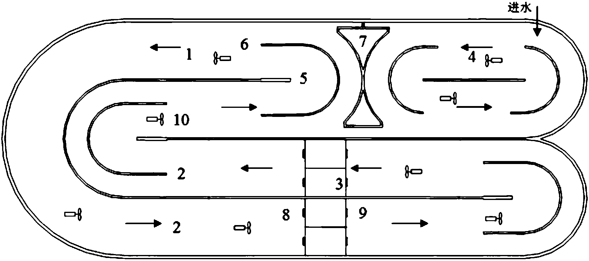 5.如權(quán)利要求4所述的氧化溝膜生物反應(yīng)器,其特征在于,所述弧形導(dǎo)流墻(6)設(shè)置于中間隔墻(5)的自由端。
