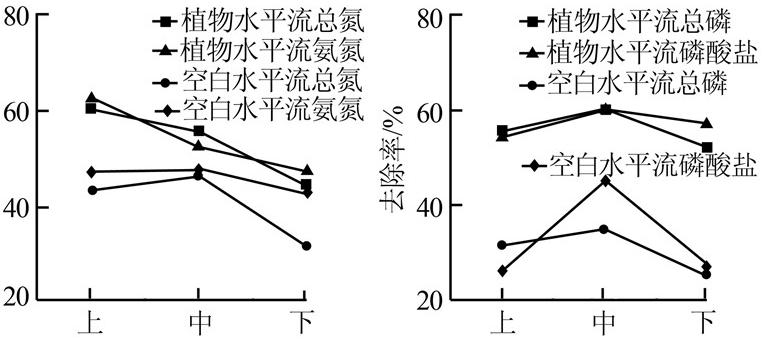 為提高水平潛流人工濕地的處理效果和預(yù)防堵塞,實(shí)驗(yàn)在濕地上、下基質(zhì)層采用大粒徑礫石,以利于濕地通過(guò)上部空間進(jìn)行富氧及植物根系向濕地下部深處進(jìn)行繁殖;中間層采用小粒徑礫石,便于增加礫石表面積,從而加大濕地基質(zhì)與污水的接觸面積和微生物的附著面積。濕地對(duì)營(yíng)養(yǎng)物去除率的空間變化情況如圖 3所示。