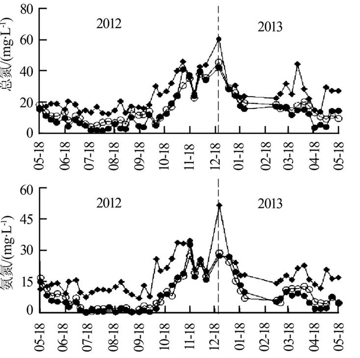 實(shí)驗(yàn)從2012年5月18日至2013年5月18日為期1 a。為了研究植物和基質(zhì)級(jí)配對(duì)營(yíng)養(yǎng)物去除效果的影響,在距離濕地進(jìn)水口水平方向的1/4、2/4和3/4處分別采集深度為7.5、25、45 cm(各種級(jí)配基質(zhì)的中間層)的水樣。濕地進(jìn)出水水樣每周取一次,DO采用HQ30d便攜式溶解氧測(cè)定儀(美國(guó)哈希公司)測(cè)定,TN、NH3-N、NO3--N、NO2--N、TP、PO43--P、COD、BOD5和SS按照《水和廢水監(jiān)測(cè)分析方法》〔8〕測(cè)定。濕地植物于2012年5月26日基本長(zhǎng)出,于2012年10月5日收割,生長(zhǎng)期為132 d。收割時(shí)保留植物根部及基質(zhì)以上10 cm的莖稈。植物樣品的氮磷含量采用H2SO4-H2O2消解法測(cè)定〔9〕。