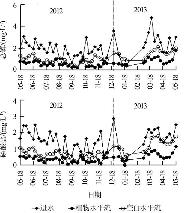 1號(hào)和2號(hào)濕地出水中的TP、PO43--P分別為(0.6±0.04)、(0.4±0.03) mg/L和(1.1±0.06)、(0.9±0.06) mg/L〔p(TP)=0.004,p(PO43--P)=0.000〕,說(shuō)明與脫氮相比,植物對(duì)濕地除磷的影響更為明顯且差異性更為顯著,種植植物的水平潛流濕地對(duì)磷的去除效果更好且更加穩(wěn)定。這表明植物在水平潛流濕地中不僅對(duì)磷進(jìn)行直接吸收,還優(yōu)化了濕地對(duì)磷吸附去除的條件〔11〕。與脫氮不同的是水平潛流濕地對(duì)磷去除率的下降發(fā)生在春季,可能是這段時(shí)間濕地中藻類生長(zhǎng)造成的。