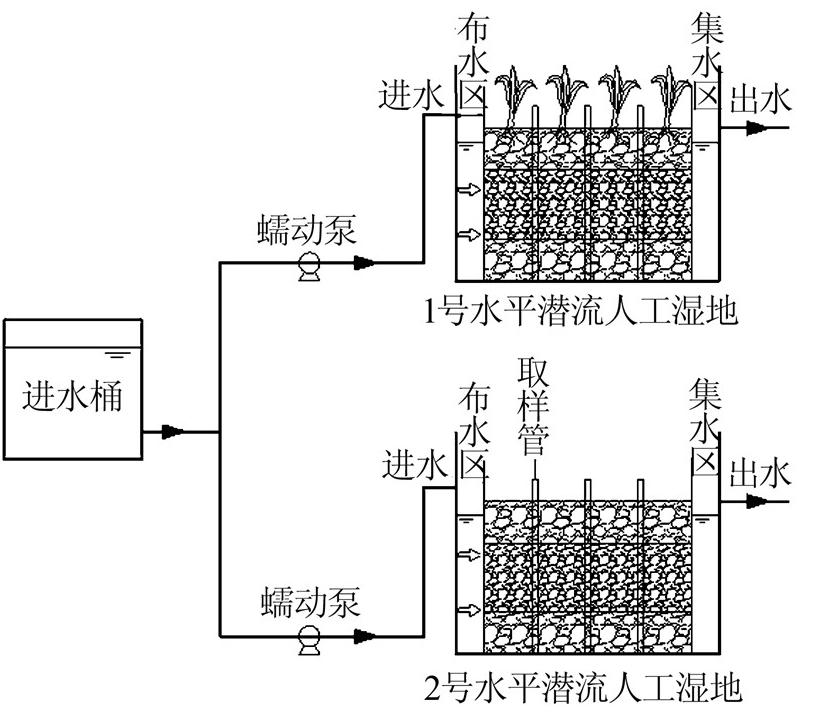 于西安建筑科技大學(xué)校內(nèi)構(gòu)建2組結(jié)構(gòu)相同的由有機(jī)玻璃構(gòu)成的水平潛流人工濕地(尺寸均為0.75 m×0.4 m×0.8 m)。為了獲得較好的水力性能和處理效果,實(shí)驗(yàn)采用了不同粒徑的填料組成,其礫石粒徑配比從下到上為15 cm大粒徑(d:15~30 mm)、25 cm小粒徑(d:5~15 mm)、15 cm大粒徑(d:15~30 mm),基質(zhì)孔隙率為50%。1號(hào)濕地為種植蘆葦?shù)乃綕摿鳚竦兀N植密度為13株/m2,2號(hào)濕地為未種植植物的空白水平潛流濕地。礫石、蘆葦均取自西安皂河附近。