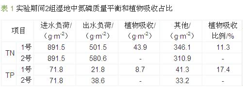 秋季對(duì)1號(hào)濕地中的植物進(jìn)行收割,通過(guò)測(cè)量植物干重和植物內(nèi)的氮磷含量,得到實(shí)驗(yàn)期間通過(guò)植物吸收所去除的營(yíng)養(yǎng)物總量,并與2號(hào)濕地進(jìn)行對(duì)比,結(jié)果如表 1所示。