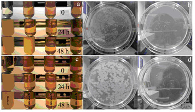 圖 4 Ag-PDA-石墨烯復(fù)合粒子對(duì)E.coil (a,b)和B.subtilis (c,d)的抗菌效果