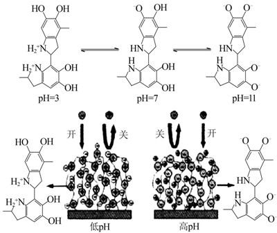 多巴胺(dopamine),一種生物神經(jīng)遞質(zhì)。2007年,H. Lee等〔2〕從貽貝的黏附蛋白中獲得啟發(fā),利用多巴胺研究了其在不同有機(jī)、無機(jī)材料表面的自聚涂覆功能,并成功形成了功能化的改性表面。自此,有關(guān)多巴胺在除神經(jīng)學(xué)外的應(yīng)用報(bào)道不斷引起人們的關(guān)注。基于多巴胺的黏附性、還原性以及生物相容性,多巴胺及其衍生的復(fù)合粒子逐漸被用于各個(gè)領(lǐng)域,如抗菌〔3〕、催化〔4〕、生物傳感器〔5〕、細(xì)胞成像〔6〕、膜技術(shù)、吸附等。盡管多巴胺具體的黏附機(jī)理還不是很清楚,但是科研人員普遍認(rèn)為,這種性能與多巴胺所含有的鄰苯二酚和氨基官能團(tuán)有關(guān)。其中被廣泛接受的解釋有2種,一種是在不同的pH下,多巴胺自聚后所帶電荷不同(見圖 1)〔7〕,從而使得其所附著的材料表現(xiàn)出不同的功能;另一種是在水溶液中,多巴胺的鄰苯二酚基團(tuán)容易被氧化,生成含有鄰苯二醌結(jié)構(gòu)的醌化合物,多巴胺和其醌化合物發(fā)生反歧化反應(yīng),產(chǎn)生醌自由基,耦合形成交聯(lián)鍵,從而在基體材料表面形成緊密附著的交聯(lián)復(fù)合〔8〕。這與隨后發(fā)現(xiàn)的多巴胺表現(xiàn)出還原性能〔9〕具有一致性。從多巴胺和氧化石墨烯的反應(yīng)(見圖 2)可直接觀察到,混合了多巴胺的氧化石墨烯經(jīng)過濾后,顏色變黑,說明氧化石墨烯被還原〔9〕。隨著多巴胺在除神經(jīng)學(xué)領(lǐng)域外應(yīng)用的增多,需對(duì)其作用機(jī)理進(jìn)行深入研究,從而使其得到更廣泛的應(yīng)用。