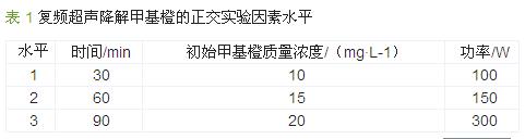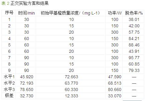 (2)正交實(shí)驗(yàn)。以超聲作用時(shí)間、甲基橙初始濃度及超聲功率為影響因素,以脫色率為評(píng)價(jià)指標(biāo)進(jìn)行正交實(shí)驗(yàn),考察各因素對(duì)處理效果的影響。