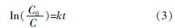 通過分析得知,杭錦土負載納米零價鐵對甲基橙的降解反應屬于非均相反應,反應過程可用一級反應動力學模型來描述[20]: