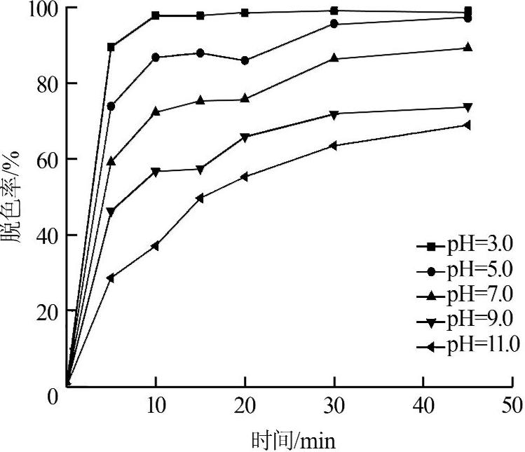 取200 mL質量濃度為 50 mg/L的甲基橙溶液于500 mL燒杯中,在負載比為1∶3、投加量為3 g/L、25 ℃條件下,調節甲基橙溶液pH分別至3.0、5.0、7.0、9.0、11.0,考察初始pH對甲基橙溶液降解效果的影響,結果如圖4所示。