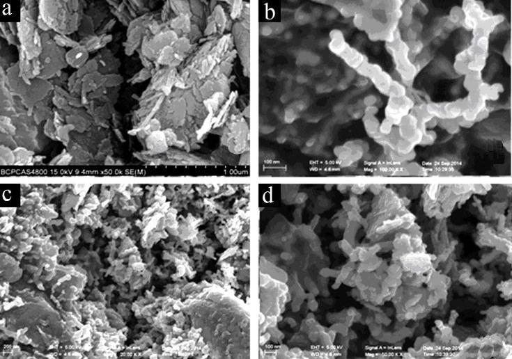 圖1(a)為天然杭錦土,其在掃描電鏡下呈棒狀、纖維狀、鱗片狀結構;圖1(b)為納米零價鐵,鐵球呈鏈狀聚集體;圖1(c)、(d)為負載型納米零價鐵,納米鐵球均勻分布在鱗片狀、棒狀、纖維狀結構的杭錦土表面。SEM結果表明負載型納米零價鐵的鐵球均勻地分散在杭錦土表面,可減少納米零價鐵顆粒的聚集。