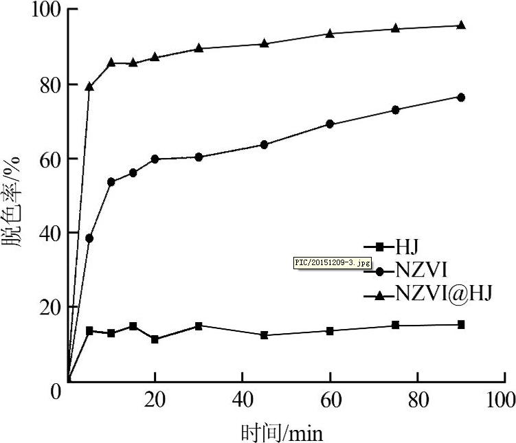 取200 mL質量濃度為 50 mg/L甲基橙溶液置于500 mL燒杯中,分別將杭錦土(HJ)、納米零價鐵(NZVI)、負載質量比為1∶1的負載型納米零價鐵(NZVI@HJ)加入甲基橙模擬溶液中,投加量分別為1.5、1.5、3 g/L,在初始pH為6.80、25 ℃條件下考察不同材料對甲基橙的降解情況,如圖3所示。