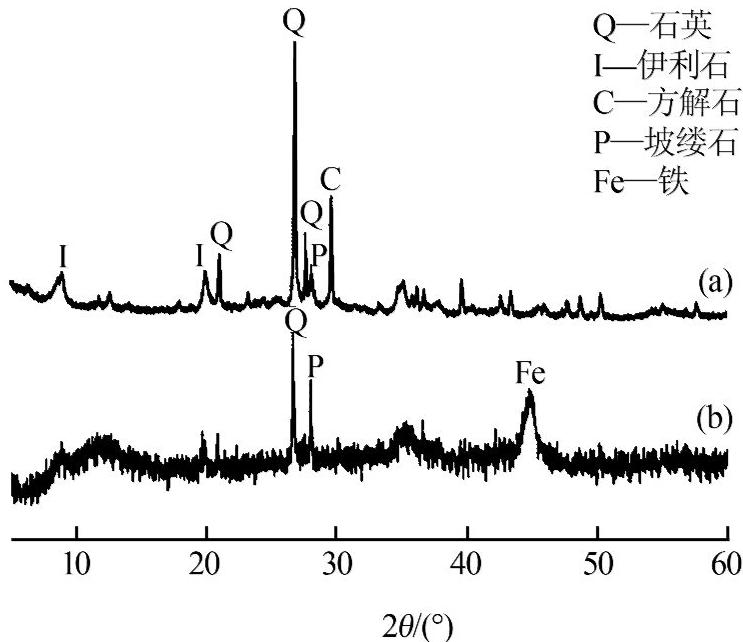 圖2(a)、(b)分別為杭錦土、杭錦土負載納米零價鐵的XRD譜圖。由圖2(a)可以看出杭錦土的主要礦物相為石英、伊利石、方解石、坡縷石,這些礦物相的檢出與掃描電鏡下觀察到的礦物相形態相符,證實了杭錦土中這4種礦物相的存在。由圖2(b)發現α-Fe特征衍射峰(2θ為44.8°)的出現,表明Fe0顆粒成功負載到杭錦土上[8]。