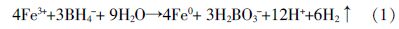 將磨碎的天然杭錦土在60 ℃鼓風干燥箱內烘干12 h,過0.074 mm(200目)篩后置于真空干燥器中備用。取2.0 g預處理的杭錦土置于三口燒瓶中,稱取9.66 g FeCl3·6H2O溶于50 mL乙醇溶液(40 mL無水乙醇、10 mL水)中,充分溶解后轉移至三口燒瓶中,在氮氣氛圍下磁力攪拌15 min。另稱取3.54 g NaBH4溶于100 mL水中后轉移至梨形分液漏斗中,在持續通入氮氣條件下以每秒2~3滴的速度逐滴加入三口燒瓶混合液中,整個反應過程中三口燒瓶中的溶液顏色由黃色變為灰色后生成黑色凝膠物質,表明生成了零價鐵。滴加完成后繼續在氮氣氛圍下攪拌20 min以保證體系中的Fe3+被充分還原。反應完成后,用無水乙醇將生成產物轉移至砂芯漏斗快速抽濾,抽濾過程中用無水乙醇洗滌3次以去除殘余的硼氫化鈉和氯化鈉等雜質,回收濾渣并將濕產品置于真空干燥箱于75 ℃隔夜(10~12 h)干燥即可得到負載型納米零價鐵材料。反應式[7]為: