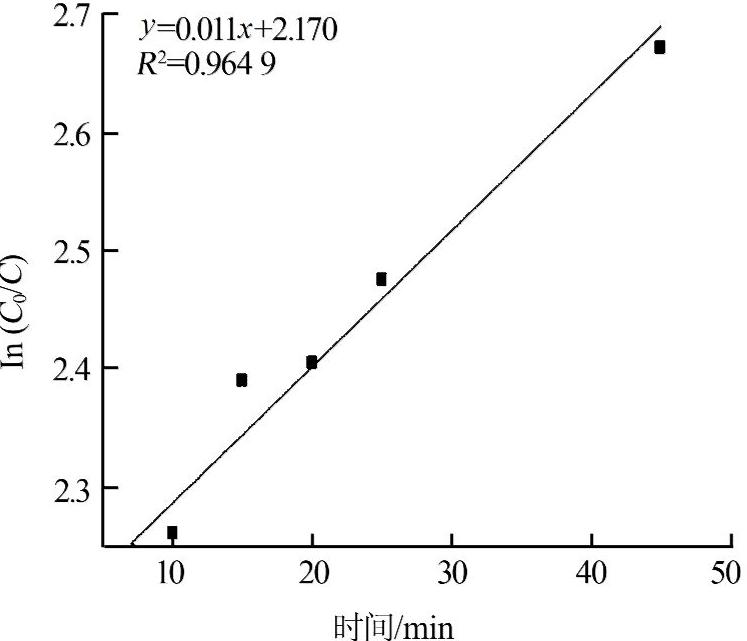 圖6顯示ln(C0 /C)與t呈現良好的線性相關性,R2=0.964 9,說明負載型納米零價鐵對甲基橙的降解反應遵循一級反應動力學規律。