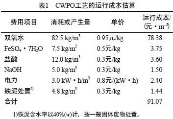 c)本CWPO工藝的運行成本約為91元/m3,低于三效蒸發脫鹽工藝的運行成本,企業能夠接受。