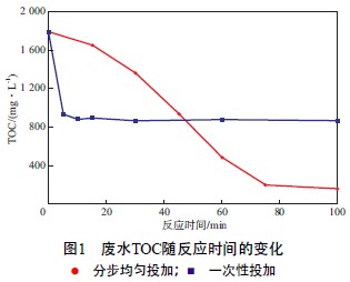 b)氧化劑雙氧水和催化劑FeSO4·7H2O2分成多次投加時TOC的去除效果明顯優于一次性投加,大規模工業化應用時可以采用連續緩慢滴加(或流加)的方式投加。