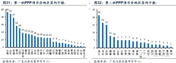 落地項目集中在市政、公共服務領域,占比約半數。從行業分布看,兩批簽約的項目主要集中在市政、公共服務及交通等領域,其中污水處理、公用事業等基建投資項目數占比約48%(兩批項目合計比例)�?偣埠灱s的619個項目中,污水、垃圾處理項目173個,占28%;供水、供熱、燃氣等項目127個,占20%;鐵路、公路、港口等項目98個,占16%;學校、醫院、體育等項目74個,占12%。值得關注的是,第二批簽約項目中,學校、醫院、體育等項目僅有10個,比批減少了54個。這可能與地方財政收入有限,導致政府付費為主的PPP項目減少有關。