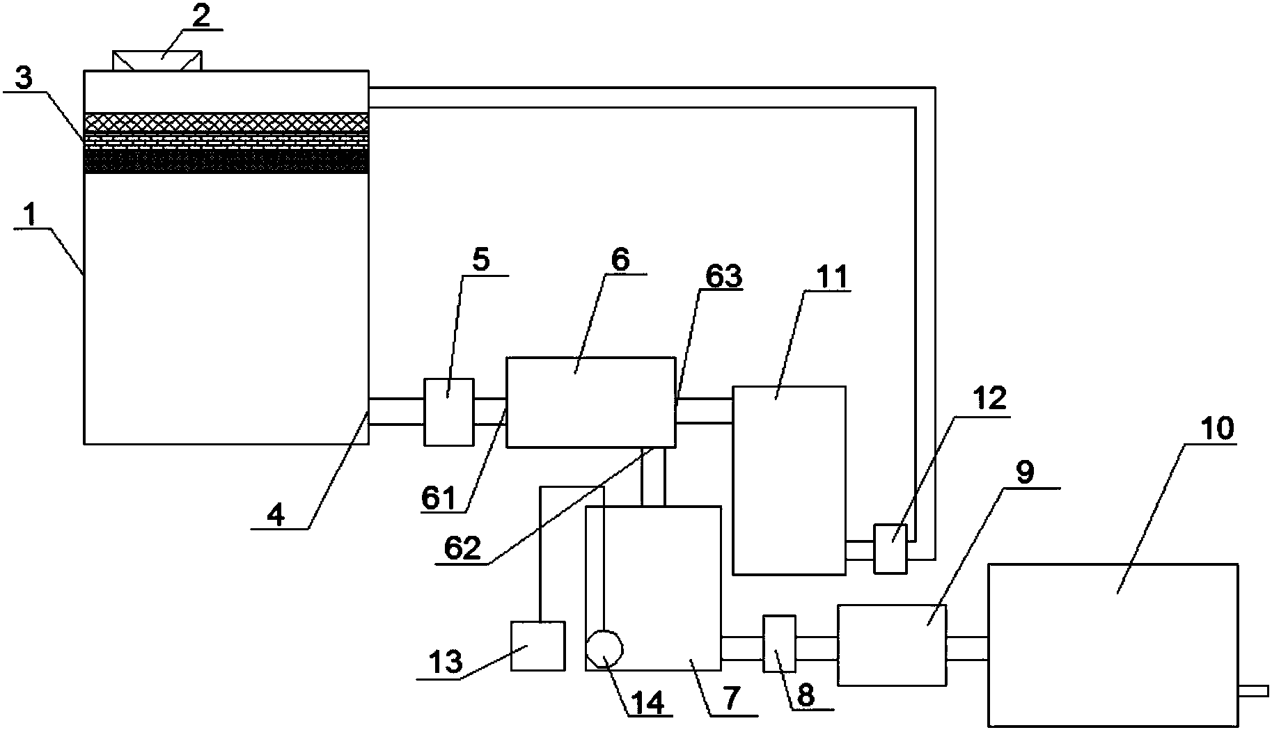 1.一種環保型廢水回收設備,其特征在于:包括廢水收集箱(1),所述廢水收集箱(1)上設置有廢水入口(2),所述廢水收集箱(1)內設置有過濾層(3),所述廢水收集箱(1)下端設置有廢水出口(4),所述廢水出口(4)依次連接有抽水泵(5)、管式膜組件(6)、透過液箱(7)、第二抽水泵(8)、反滲透膜組件(9)和回收水箱(10),所述管式膜組件(6)包括進水口(61)、透過液出口(62)和濃縮液出口(63),所述抽水泵(5)與所述進水口(61)連接,所述透過液出口(62)與所述透過液箱(7)連接,所述濃縮液出口(63)依次連接有濃縮液箱(11)和第三抽水泵(12),所述第三抽水泵(12)的出口與所述廢水收集箱(1)連通,所述透過液箱(7)一側設置有臭氧機(13),所述臭氧機(13)上設置有氣爆石(14),所述氣爆石(14)位于所述透過液箱(7)內。