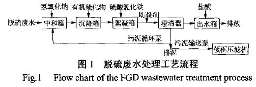 脫硫廢水包括廢水處理、加藥、污泥處理3個(gè)分系統(tǒng)。廢水通過(guò)管路流入中和箱,同時(shí)按比例加入制備合格的石灰漿液,將中和箱pH調(diào)整到9.2+0.3,此pH范圍適合大多數(shù)重金屬離子的沉淀。并非所有重金屬可通過(guò)與石灰漿作用形成很好的沉淀,其中主要是鎘和汞。因此,需要在沉降箱中按比例加入重金屬沉淀劑有機(jī)硫化物(TMTl5)。