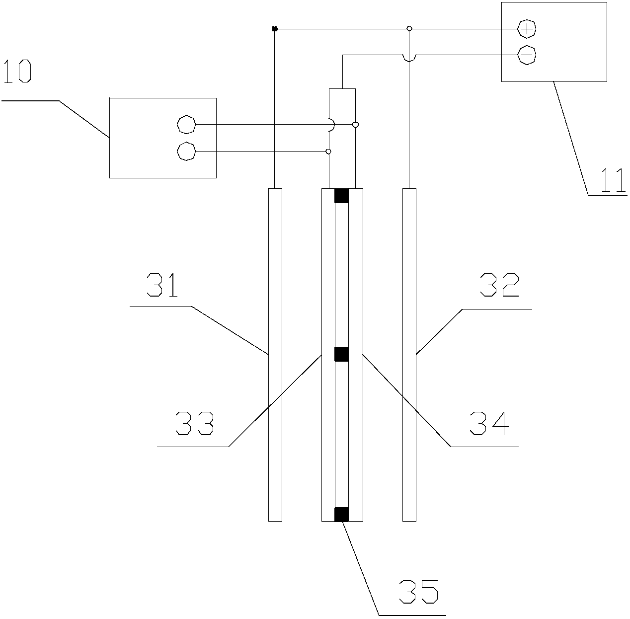為增加裝置的自動化,優(yōu)選地,還設(shè)有控制器,所述工作電源和除垢電源均接入并受控于該控制器。兩個電源之間的切換及除垢電源的倒極均有該控制器控制。