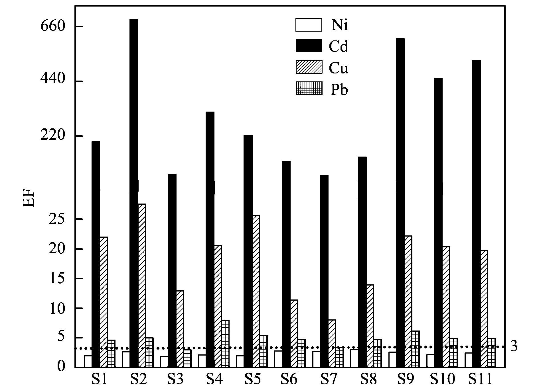 采用重金屬實測值與工業(yè)化以前長江系沉積物中重金屬的平均含量的比值即富集系數(shù)(EF)來判斷沉積物中重金屬元素的富集程度及人為影響狀況.各采樣點重金屬的富集系數(shù)如圖 3所示.沉積物中各重金屬富集系數(shù)大小順序為Cd(308.51)>Cu(18.58)>Pb(4.97)>Ni(2.38).已有研究指出, 若EF大于3, 屬于嚴重污染等級.除所有采樣點中Ni的EF值小于3和S3點位中Pb的EF值(2.94) 接近3外, 各采樣點沉積物中重金屬的EF值均大于3, 存在重度富集現(xiàn)象; 尤其是Cd累積比較為典型, 其EF值介于60.88~688.76, 在研究區(qū)沉積物中的含量變化范圍為15.22~172.19 mg·kg-1, 是比較主要的污染貢獻元素, 表明大冶湖沉積物Cd重度污染除受大冶湖流域內(nèi)過度施用農(nóng)藥和化肥等農(nóng)業(yè)活動輸入影響外, 很大程度上受有色金屬冶煉、化肥使用及礦山開采等活動廢水排放的影響.