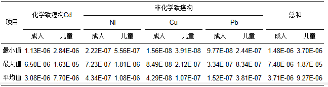 基于水環(huán)境健康風險評價模型及參數(shù), 計算出大冶湖水體中化學(xué)致癌物(Cd)和非致癌物(Ni、Cu和Pb)通過飲用途徑所致的個人年健康風險, 結(jié)果見表 3.