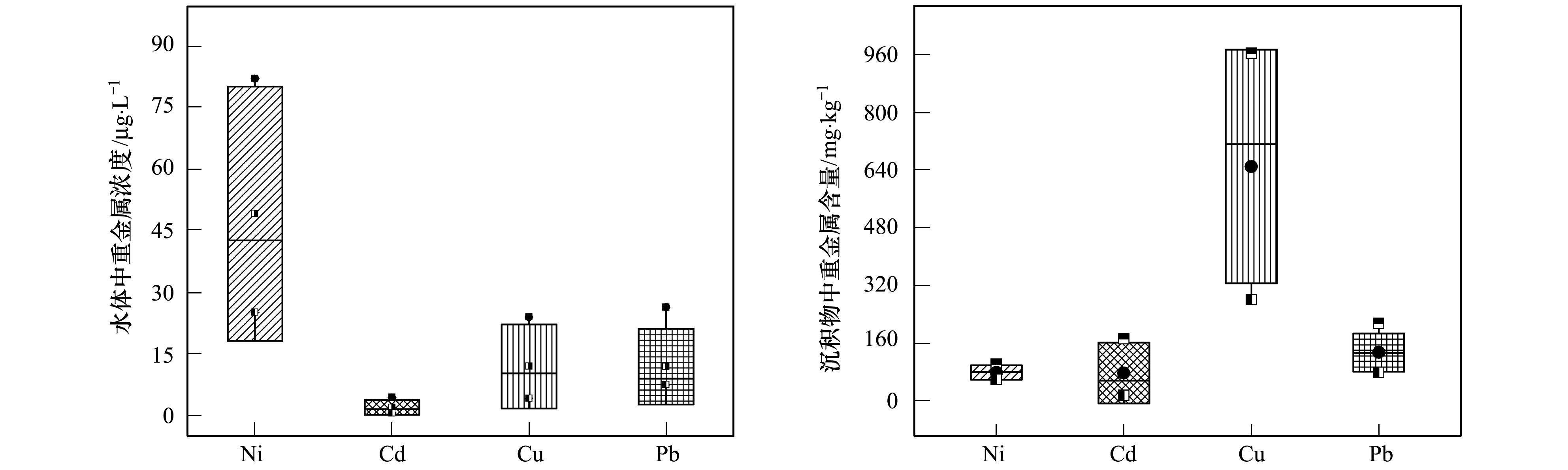 水樣帶回實驗室后, 通過“王水+雙氧水”加熱濃縮, 經(jīng)過濾并測其重金屬含量.沉積物樣品置于通風處自然風干后, 經(jīng)碾碎、剔除雜質(zhì)、研磨、篩分等前期處理操作, 用傳統(tǒng)的封閉式混合酸(HCl-HNO3-HF-HClO4)法高溫消解后, 使用火焰原子吸收分光光度計(美國Varian AA240) 測定樣品中重金屬污染元素Ni、Cd、Cu和Pb.在實驗過程中供試試劑均為優(yōu)級純, 所用器皿均用王水浸泡24 h以上.同時, 質(zhì)量保證采用三平行樣和加標回收法; 其中, 樣品分析數(shù)據(jù)的標準偏差(RSD)均在10%以內(nèi); 對國家土壤成分分析標準物質(zhì)(GSS-3、GSS-5) 進行回收率分析時, 各元素回收率在86%~115%之間.所有數(shù)據(jù)均基于Excel 2013、SPSS 22.0和Origin 9.0等軟件進行統(tǒng)計分析.