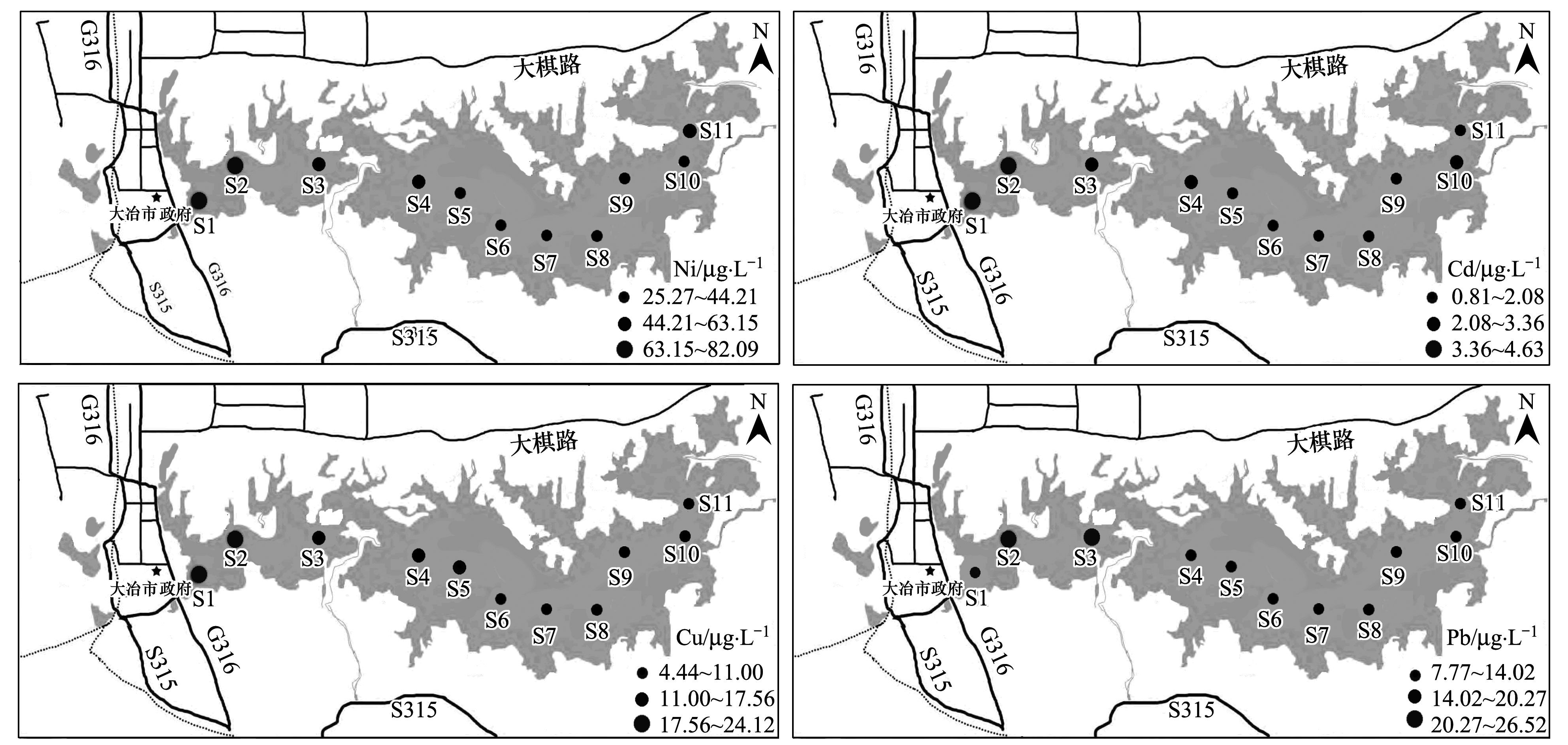 重金屬(Ni、Cd、Pb和Cu)元素污染分布特征表現(xiàn)為:大冶湖表層水和沉積物中重金屬元素污染主要分布在市政污水和工業(yè)廢水排污口較集中的湖灣區(qū)域, 而中部重金屬污染總體趨勢一致; 究其原因, 大冶湖湖灣(S1、S2和S11) 周邊分散著多家大型國有高污染礦冶企業(yè)以及大量“五小”(小選礦、小洗礦、小冶煉、小紅磚、小化工)企業(yè).此外, 大冶湖流域植被覆蓋率低, 山體裸露, 地質(zhì)災(zāi)害時有發(fā)生, 水域面積不斷縮小, 人口數(shù)量不斷增加, 同樣也會直接導(dǎo)致大冶湖湖灣處重金屬污染更為嚴重.由于大冶湖是半封閉的水體, 流動性及與其他水體交換能力低; 大量重金屬污染物主要以懸浮物的形式, 通過各種途徑進入湖泊水體后, 隨著水流的搬運以及重力沉降作用, 比較終遷移至湖泊沉積物中, 導(dǎo)致大冶湖中部水體重金屬分布較均勻.