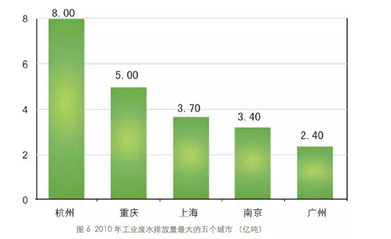 作為中國(guó)制造業(yè)聚集地,長(zhǎng)三角和珠三角的三個(gè)省份必定入榜,如圖5所示,五大省份的工業(yè)廢水排放量占了全國(guó)總量的44%。若以城市排放量為依據(jù),則如圖6所示,這五大城市的排放量占全國(guó)工業(yè)廢水排放總量的9%強(qiáng)。可以看出,這些工業(yè)廢水的主要來(lái)源地全都分布在重要水域,印證了重污染企業(yè)臨水而建的說(shuō)法。這種布局在給企業(yè)造成生產(chǎn)便利的同時(shí),也給了私自取水和非法排水等行為以可乘之機(jī),給監(jiān)管實(shí)施帶來(lái)巨大挑戰(zhàn)。
