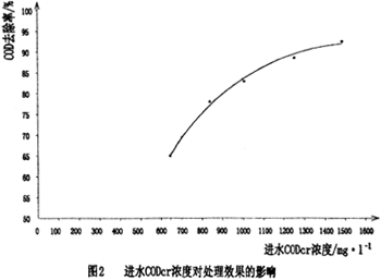 原水的CODcr變化幅度較大,比較高值在3446mg/1,比較小值是839mg/1。說明該處理工藝耐沖擊負(fù)荷能力強(qiáng),即對進(jìn)水水質(zhì)急劇變化引起的沖擊負(fù)荷的適應(yīng)能力強(qiáng)。CODcr的去除率在一定范圍內(nèi)會隨進(jìn)水CODcr濃度的提高而增長,如圖2所示。然而濃度過高,超過微生物的耐受能力時,將導(dǎo)致處理效果的降低。