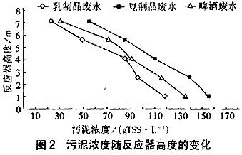 厭氧反應器中的污泥顆�;潭容^好,經2年運行后,從反應器各取樣管取樣測定污泥濃度的結果見圖2。