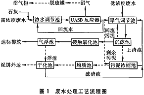 由車間排放的濃廢水自流至濃水調(diào)節(jié)池,調(diào)節(jié)pH后由污水泵提升至UASB反應器,出水一部分回流至濃水調(diào)節(jié)池,它與UASB反應器形成集調(diào)節(jié)、厭氧降解為一體的處理系統(tǒng);一部分自流至曝氣調(diào)節(jié)池與淡廢水混合,經(jīng)曝氣后由污水泵提升至沉淀池形成一級好氧系統(tǒng);此時沉淀池出水已近達標,再自流至接觸氧化池、氣浮池進行好氧生化和物化處理(見圖1)。?