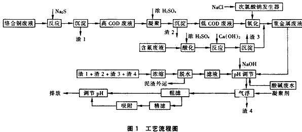 �、� 絡合銅廢液主要是化學鍍銅廢液,加入Na2S破壞銅絡合物,使Cu2+形成CuS沉淀去除。除Cu后含COD的出水再做后續處理。