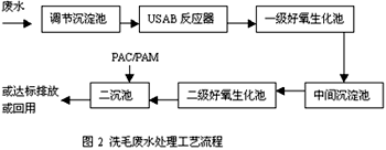 洗毛廢水是洗毛生產(chǎn)工藝排出的高濃度有機(jī)廢水,其中含有泥沙、羊毛脂、羊糞,還含有少量洗滌劑和羊毛纖維。經(jīng)化驗(yàn)分析證明:廢水中羊毛脂多已乳化,以O(shè)/W(水包油)形式存在,是組成廢水中BOD5,CODcr的主要成分。其色淡黃、味臭、粘稠、pH值為8.5~9.5,m(BOD5)/m(CODcr)為0.6左右。 根據(jù)以上廢水特點(diǎn),采用厭氧、好氧加混凝沉淀的處理工藝。由于廢水中高濃度的CODcr,BOD5主要是由羊毛脂引起(該廠廢水中羊毛脂含量少,回收價值不大),羊毛脂的化學(xué)成分為脂肪酸和高級一元醇化合而成的脂。故先采用厭氧降解高分子物質(zhì),而后再用好氧生化,利用好氧微生物的新陳代謝作用去除水中的色度。氣味、粘稠物質(zhì)等。考慮該公司管理水平,采用投資省、運(yùn)行費(fèi)用低。運(yùn)行穩(wěn)定的 UASB+二級生物接觸氧化法處理該廢水。 2.1 工藝流程 2.2.1 廢水處理工藝流程見圖2。