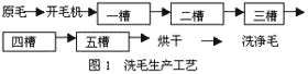 洗毛是羊毛制成品的一個中間環(huán)節(jié)。由于羊毛在原產(chǎn)地收集時雜質(zhì)較多,制成品時必須經(jīng)過一個洗滌過程,產(chǎn)生洗滌廢水。其生產(chǎn)工藝如圖1所示。