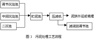 廢水由水渠進(jìn)入調(diào)節(jié)沉淀池,調(diào)節(jié)水質(zhì)、水量均勻并預(yù)沉部分較大顆粒的懸浮物后進(jìn)入UASB反應(yīng)器。通過厭氧微生物的作用去除大部分的有機(jī)物。出水進(jìn)入一級生物接觸氧化池進(jìn)行好氧生化處理,然后進(jìn)入中間沉淀池進(jìn)行泥水分離再進(jìn)入二級生物接觸氧化池進(jìn)行好氧生化處理。出水加入混凝劑PAC和絮凝劑PAM進(jìn)行混凝沉淀。二沉池出水達(dá)標(biāo)排放或回用。 此工藝中UASB消化大量污泥。只有調(diào)節(jié)池。中間沉淀池、二沉池中產(chǎn)生污泥,且量不大疏水性好。故采用污泥通過管道進(jìn)入貯泥池,然后由泵打入壓濾機(jī)房,通過壓濾機(jī)壓濾后脫水,泥餅外運(yùn)填埋或作農(nóng)肥處理。貯泥池上清液和壓濾機(jī)房濾液回流至調(diào)節(jié)沉淀池進(jìn)行處理。 3 主要構(gòu)筑物及技術(shù)參數(shù)