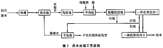 物化法和生化法聯合使用是處理印染廢水常規的典型工藝[1]。混凝沉淀具有脫色和去除懸浮物能力強的特點,同時所投加的混凝劑也可以起到一定的調節pH作用。生化法對溶解性的有機物去除能力強。在本工程中,由于廢水中的主要污染物在pH為6~9條件下為難溶性的對苯二甲酸和各種分散染料等,因此綜合廢水先經混凝沉淀,可有效地去除有機污染物、色度和調節pH值,并提高廢水的生化性能,為后續生化處理創造有利條件。生化法采用 氧化溝工藝,適用于該印染廢水水質特點和對出水水質高的要求。? 廢水處理工藝流程詳見圖1。
